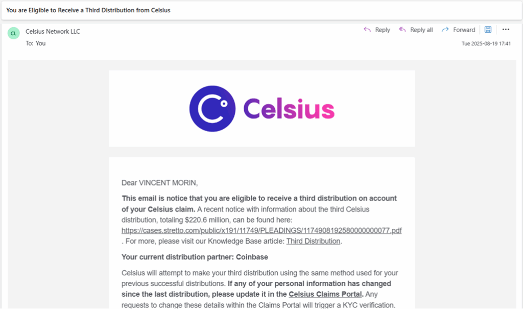 Oui. Le 30 décembre 2023, j’ai reçu un courriel de Stretto qui explique comment se préparer à recevoir la distribution de sa réclamation via Coinbase (pour les créanciers internationaux de Celsius, comme moi). Je viens d’ajouter une capture d’écran dans l’article. Puis, le 31 janvier 2024, j’ai reçu un autre courriel de Stretto avec un rappel de la procédure à suivre pour vous préparer à recevoir sa distribution initiale de cryptomonnaie via Coinbase. Notamment, créer un courriel avec la même adresse de courriel, confirmer le compte et vérifier (KYC) le compte.